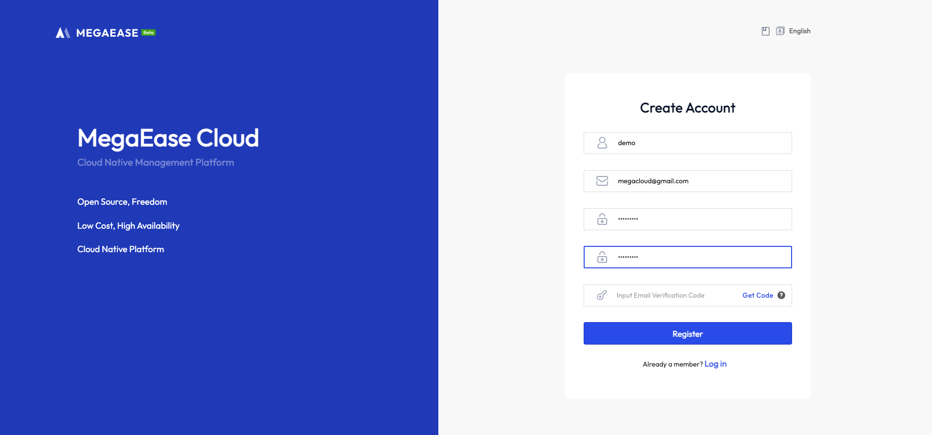 Users need to register with the MegaEase Cloud platform by email. Fill in the username and email set a strong password, obtain the verification code MegaEase Cloud send to register email, fill in the verification code, and then submit for registration.