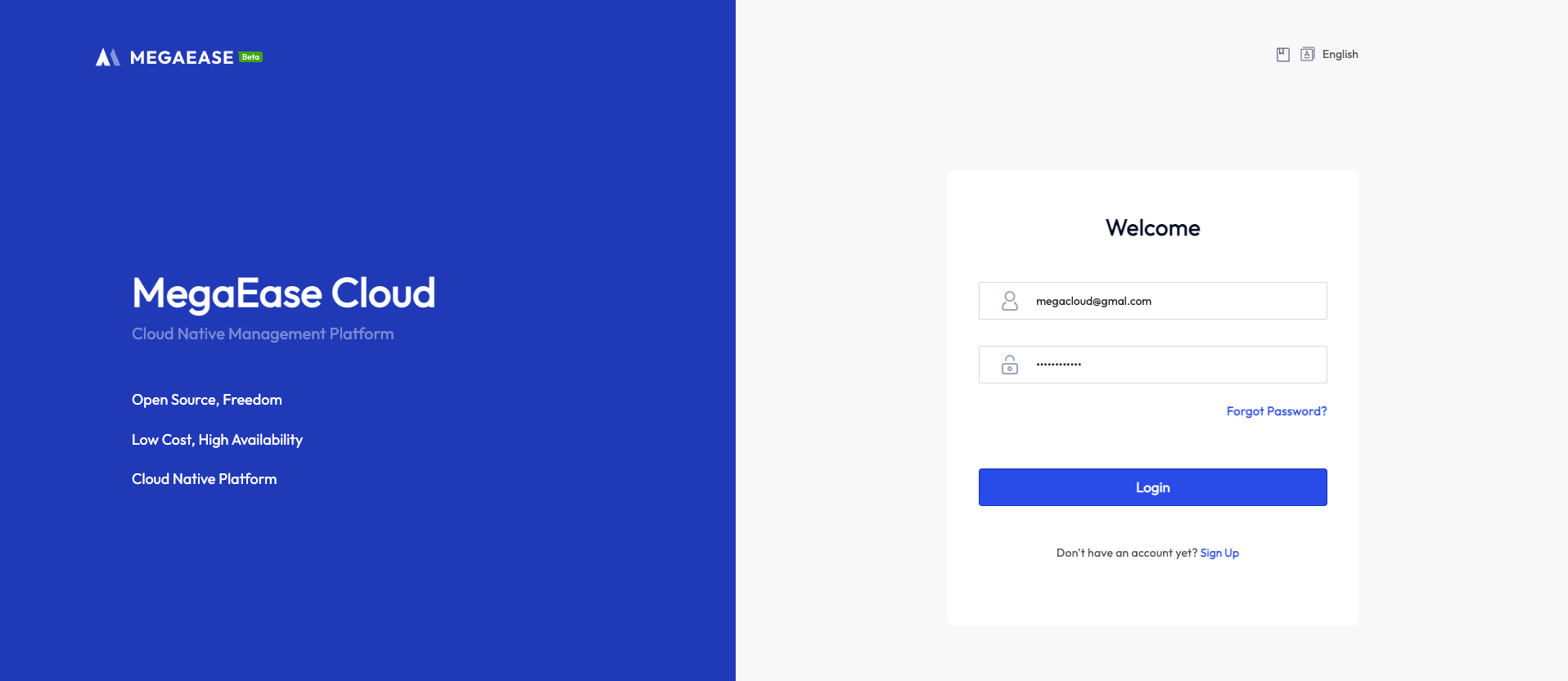 After successful registration, users can log in to the MegaEase Cloud platform, fill in the username or email address and password, and then click Login.
