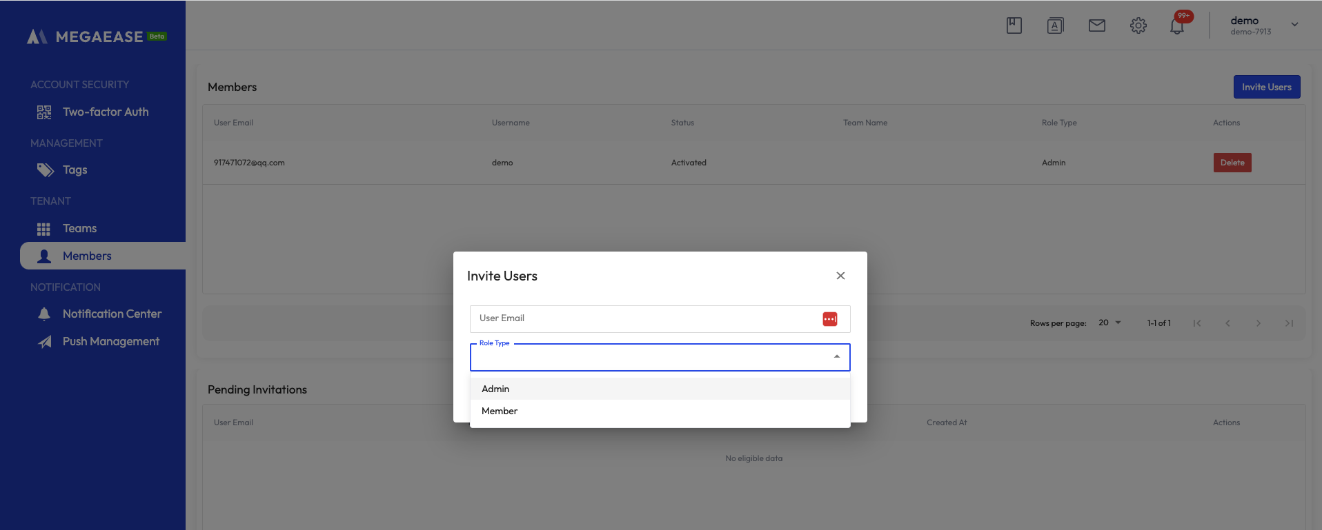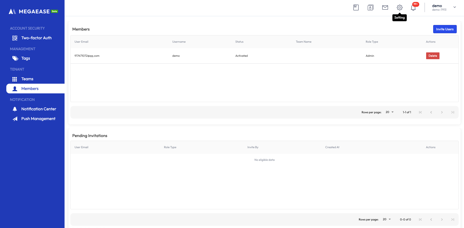 In the MegaEase Cloud platform, the same user can belong to different tenants. When a user registers, a default tenant will be created. Other tenants can also invite users to become members of the tenant.
