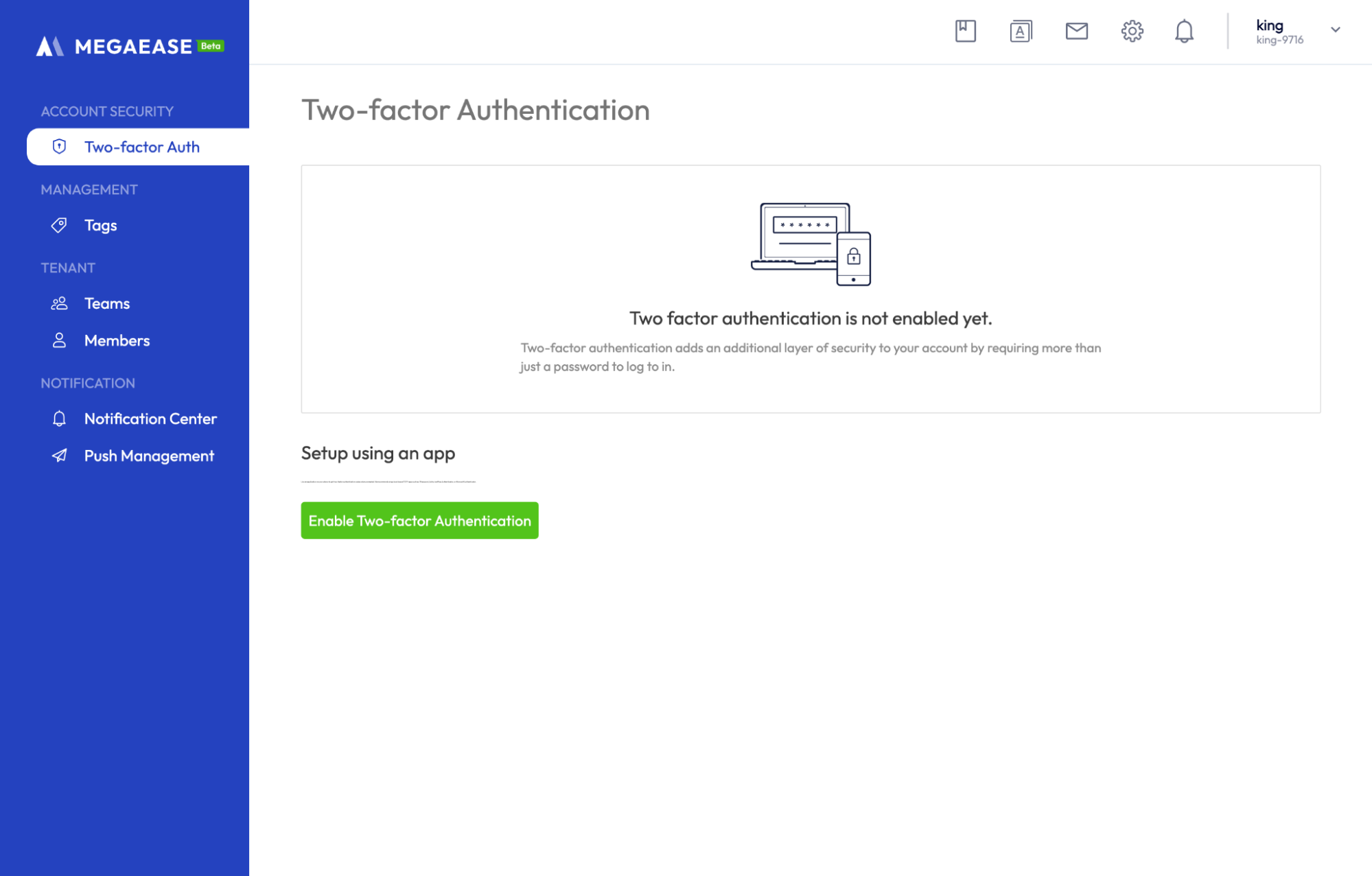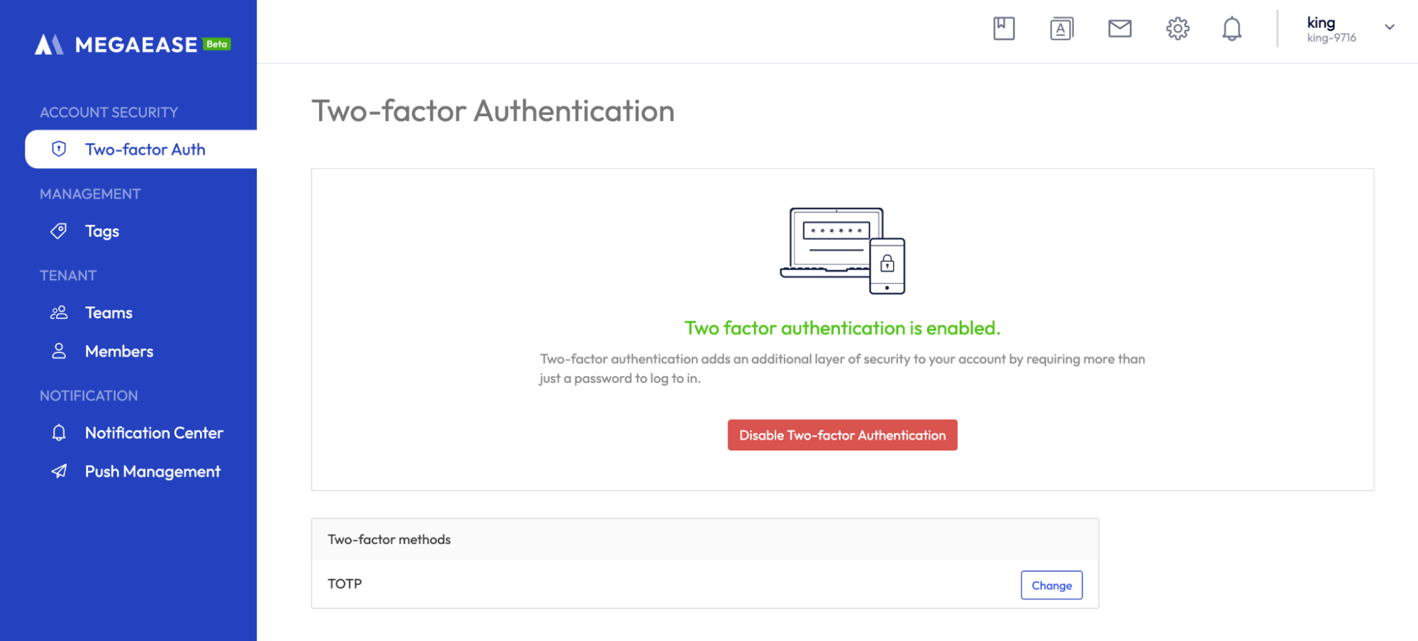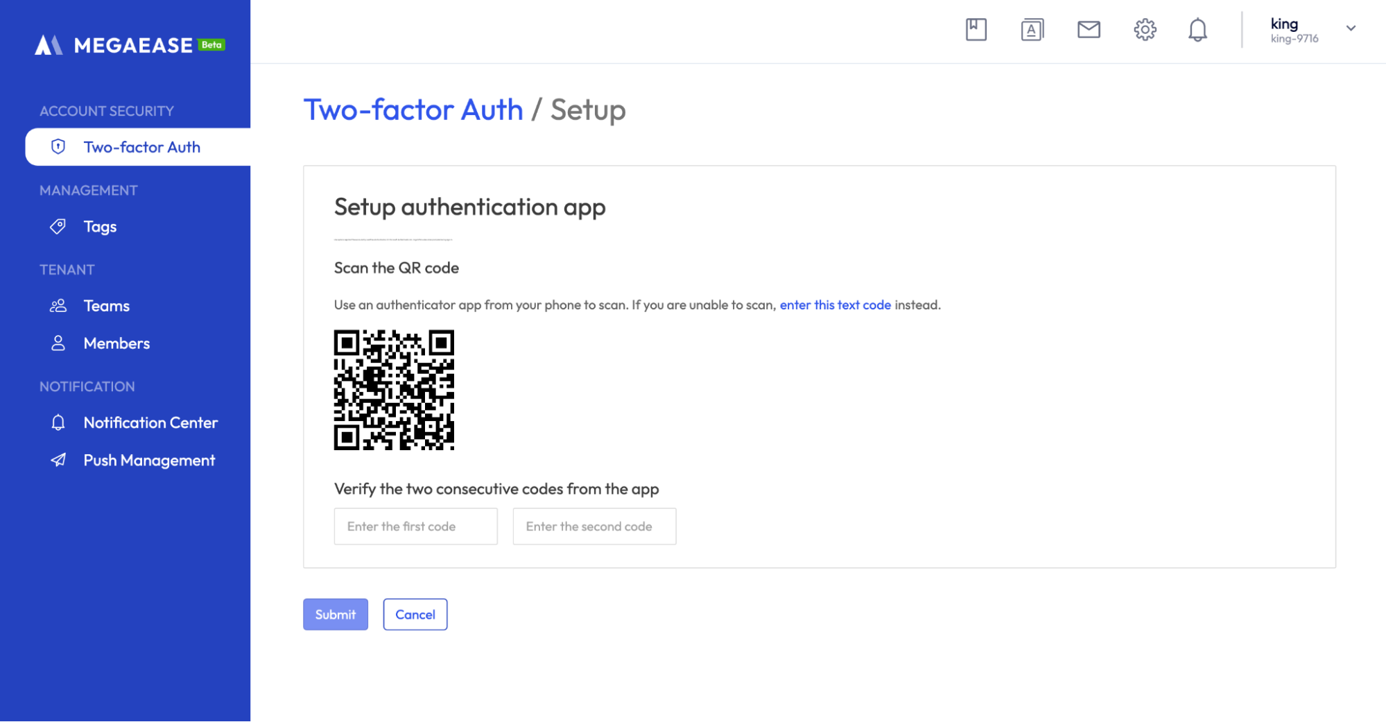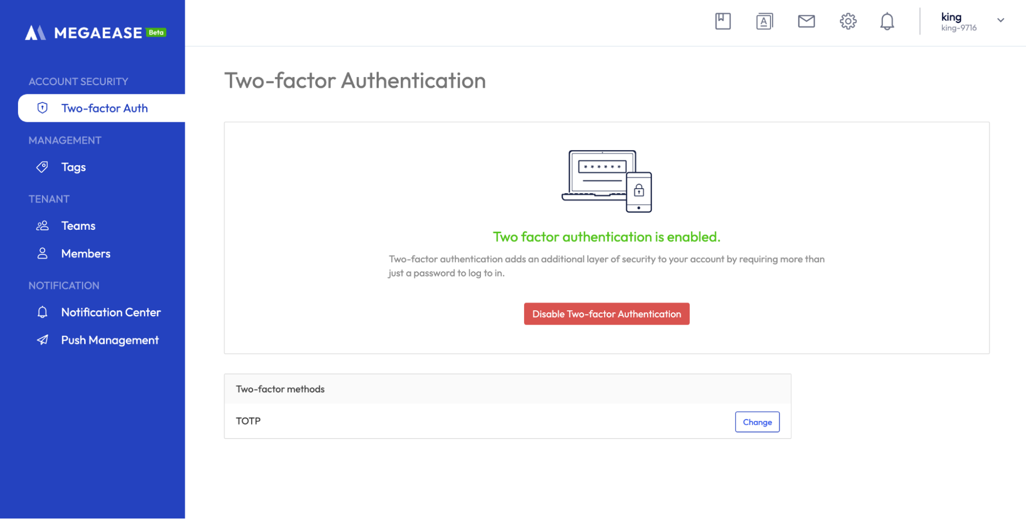2FA (Two-Factor Authentication) is an extra layer of security to protect your account. TOTP stands for Time-based One-Time Passwords (opens in a new tab) and is a common form of 2FA. This is a guide on how to use 2FA in MegaEase Cloud.