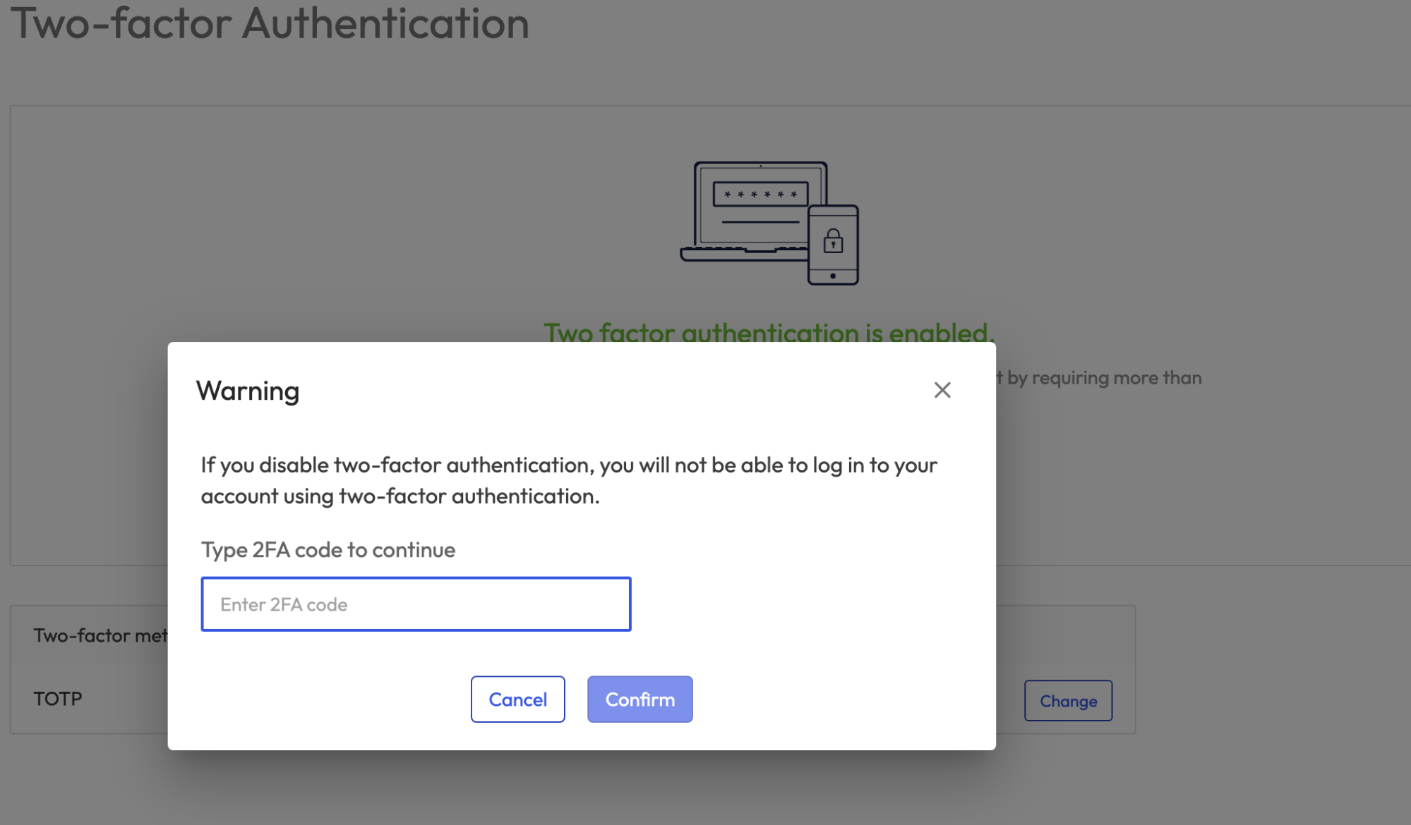 Once 2FA is enabled, an additional OTP (One-Time-Password) will be required for subsequent login operations.